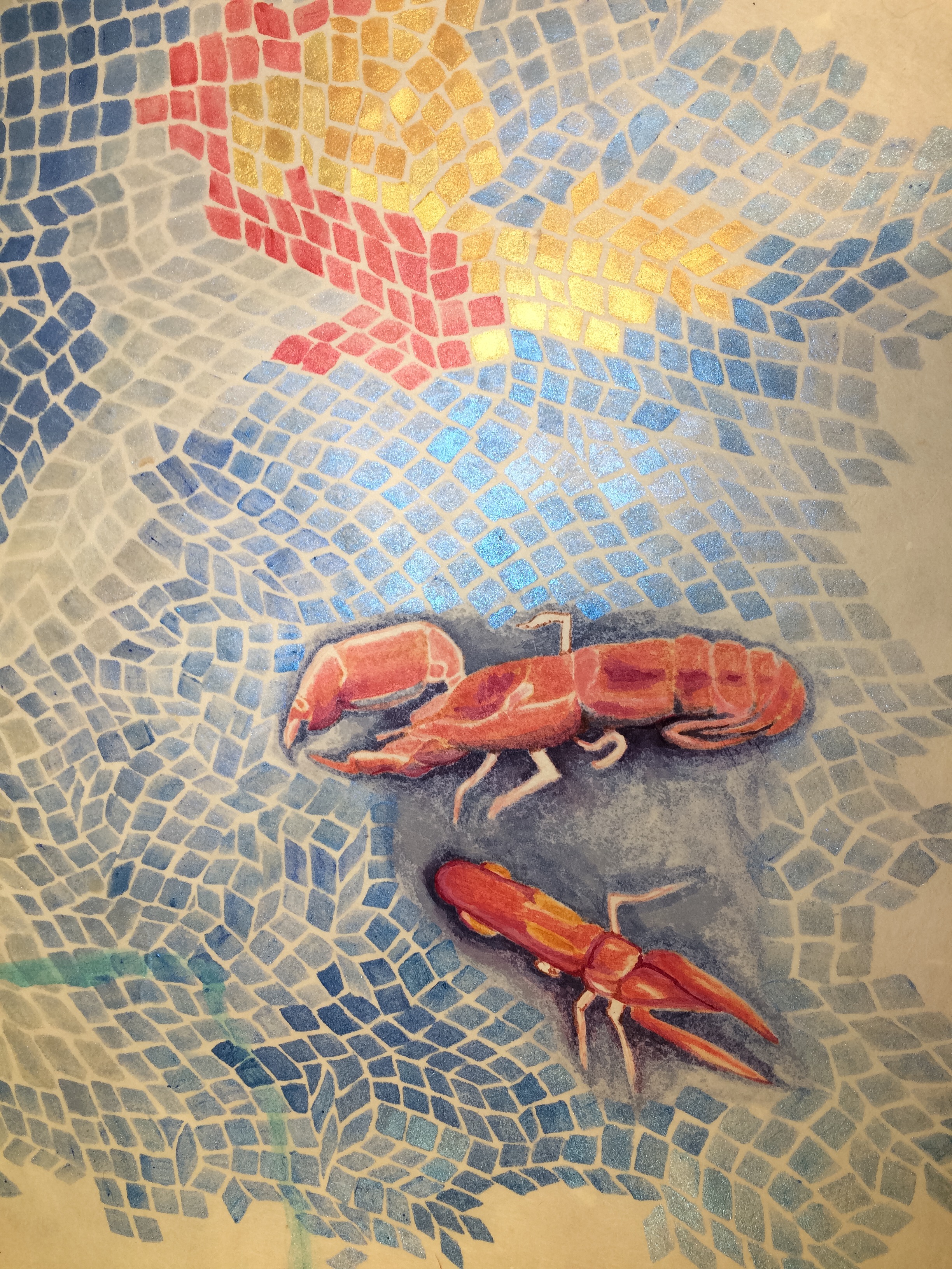 Ghost shrimp, detail from scroll, The Lay of the Land: A Tale of Skagit Marshes, Alice Dubiel, 2016, acrylic and mixed media on Hanji (korean paper), fabric